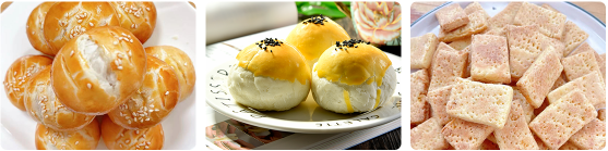 2、发酵面团类和发酵面团的制作:荷叶花卷,三色花卷,中国结,葱香火腿,豆沙包,糖酥火烧,手抓饼,鸡蛋灌饼,发糕,奶油盘丝卷等20品种。